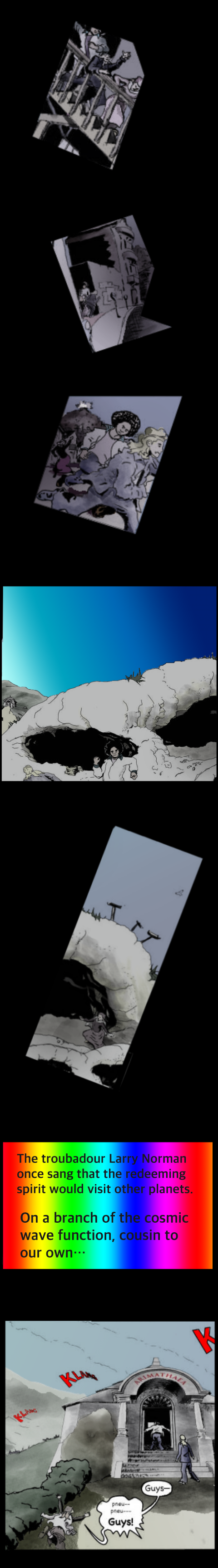 Obviously enough, the scenes rendered here don't occur in the 21st century. Neither ours nor theirs. This project started out as a mind scape nested within a conversion/deconversion narrative involving a teenager— hence the puns and maladroit pop culture allusions that a fourteen-year-old might think amusing. In a maladroit move, these scenes came out before the frame narrative that would have made more sense of them. Hence, what you see is untimely done.