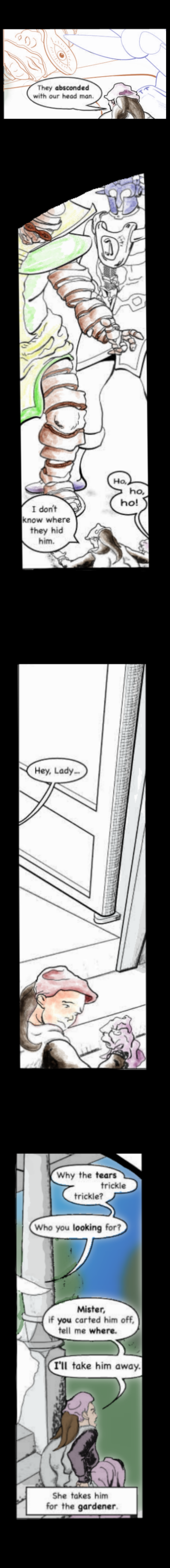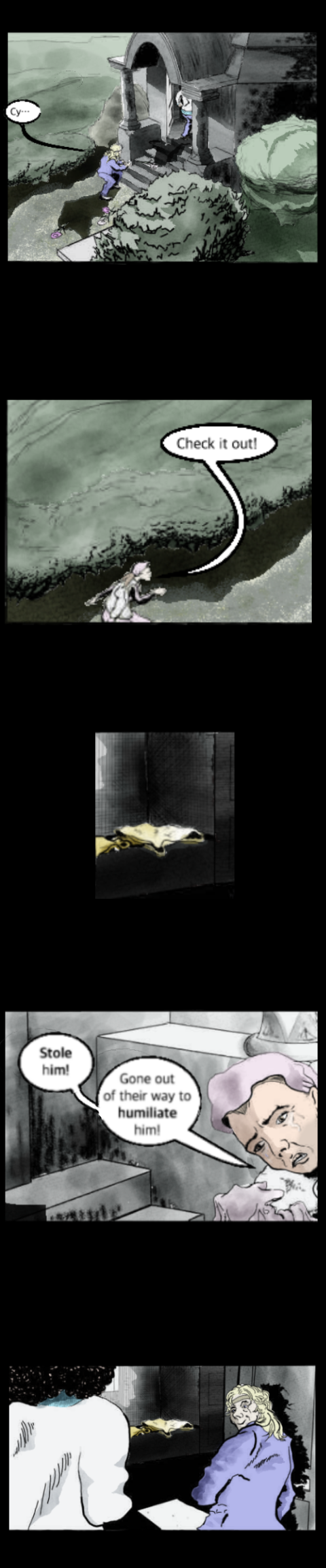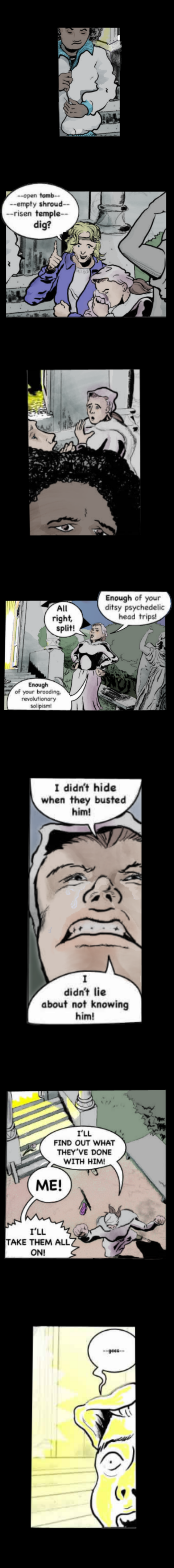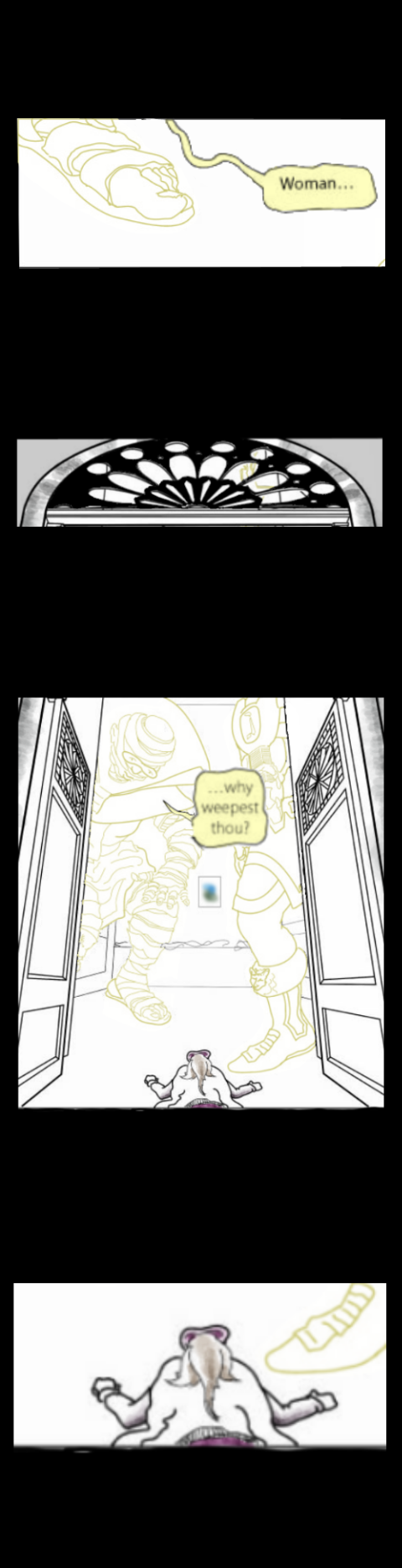 An early version was posted and put on hold, leaving several pages in episode three as suggestive sketches. The whole has been remodeled to improve how it stands on its own. Drawings got finished, color was splashed, and text retouched, taking it a step further from its source, verbally and theologically. Although evading the source text's virulent passages, this comic is well aware that it reworks an ancient anti-Semitic tract, albeit one written in its early drafts by the Evangelist most steeped in Jewish lore. This may seem odd, but its bigotry was sectarian, rather than ethnic (Boyarin 2013). The biblical text's offensive rhetoric assumed its racial overtones well after the professing church had become almost entirely gentile, the original Torah-observant Christianity having been forgotten, where not actively suppressed.